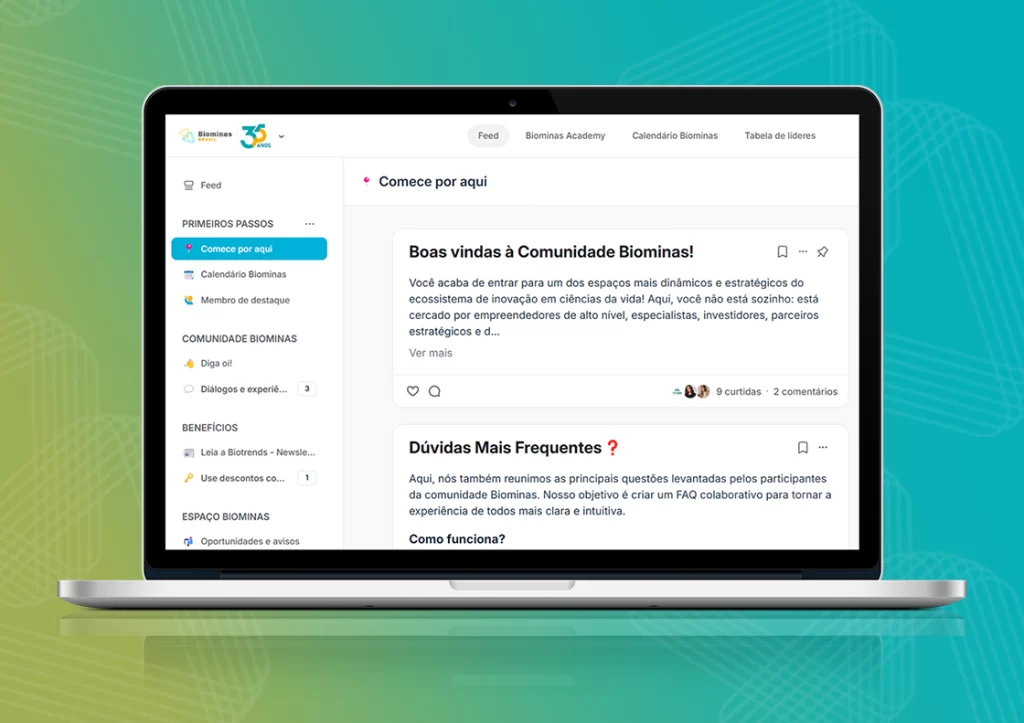 A Comunidade Biominas é uma plataforma exclusiva para startups, empreendedores, pesquisadores e empresas do setor de saúde e biotecnologia, oferecendo conexões estratégicas, conteúdos, mentorias e benefícios exclusivos.